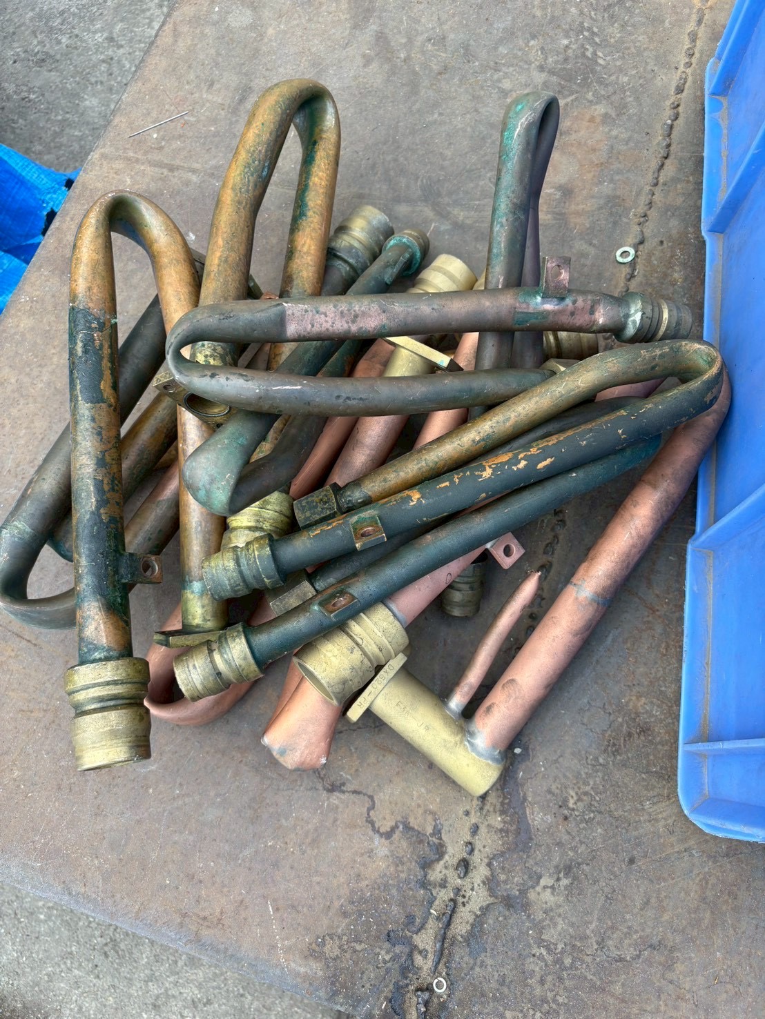 赤釜とは、 家庭用・業務用の 給湯器の内部に組み込まれている、銅製の熱交換釜(ヒートポット) のスクラップのことを指します。 給湯器は内部で水を加熱する際に、 銅でできたコイル状の釜(銅パイプの集合体) を使用しており、 この銅製パーツを解体して取り出したものを、スクラップ業界では 「赤釜」 と呼びます。 鉄付き-20円