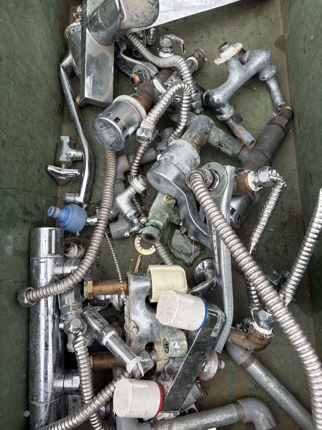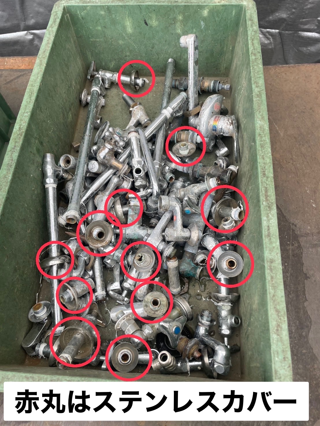 込真中⑤とは、真中を主体としながらも、ビニールホース、ステンレスホース、が付いた状態のスクラップで、解体されていないために ダスト(異物)が約30%程度含まれるもの を指します。 解体に手間がかかり、ダスト重量、処分費を考慮し、込中①の約半額となります。 ※シャワーヘッドに関してはダスト引きとして重量を1個に付きマイナス1㎏の調整となります。 ※真中の割合が少なく、シャワーヘッドなどの割合が多い場合には雑品になる場合もございます。 ビニール・ゴム・ステンレスホースなどの非金属、異種金属が大部分を占めるため、真中としての純度は低くなりますが、外側や内部に真中が一定量含まれているものを、この区分でまとめています。