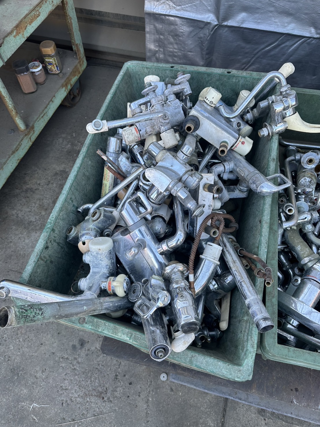 込真中⑤とは、真中を主体としながらも、ビニールホース、ステンレスホース、が付いた状態のスクラップで、解体されていないために ダスト(異物)が約30%程度含まれるもの を指します。 解体に手間がかかり、ダスト重量、処分費を考慮し、込中①の約半額となります。 ※シャワーヘッドに関してはダスト引きとして重量を1個に付きマイナス1㎏の調整となります。 ※真中の割合が少なく、シャワーヘッドなどの割合が多い場合には雑品になる場合もございます。 ビニール・ゴム・ステンレスホースなどの非金属、異種金属が大部分を占めるため、真中としての純度は低くなりますが、外側や内部に真中が一定量含まれているものを、この区分でまとめています。